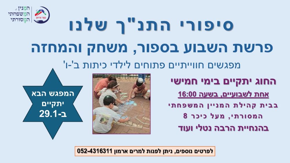 חוג פרשת השבוע ותרבות עברית לילדי כתות ב'-ו'. החוג מתקיים ביום חמישי, אחת לשבועיים בשעה 16:00.