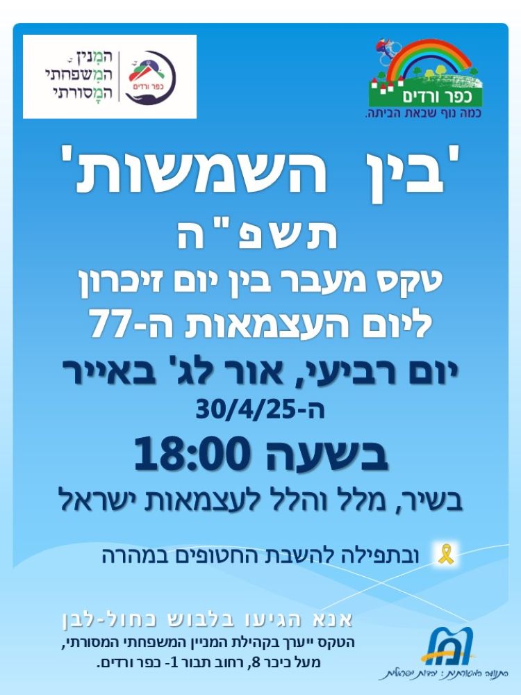 ערב יום העצמאות – יחול ביום רביעי, ג' באייר תשפ"ה, 30/4/25, ויום העצמאות יחול ביום חמישי, 1/5/25.